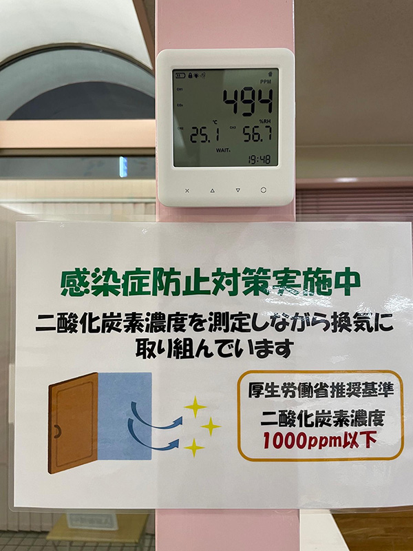 当院では、FIX窓も引き違い窓に改修工事を行いました(2020年10月の「医院からのお知らせ」をご覧ください)。たくさんの転落防止柵付きの窓がありますので、二酸化炭素濃度が常時1,000ppm以下になるよう充分な換気が可能になっています。