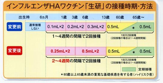 変更後:6か月以上3歳未満のものは0.25mlを皮下に、3歳以上13歳未満のものには0.5mlを皮下におよそ2-4週間の間隔をおいて2回注射する。13歳以上のものについては,0.5mlを皮下に、1回またはおよそ1-4週間の間隔うぃおいて2回注射する。